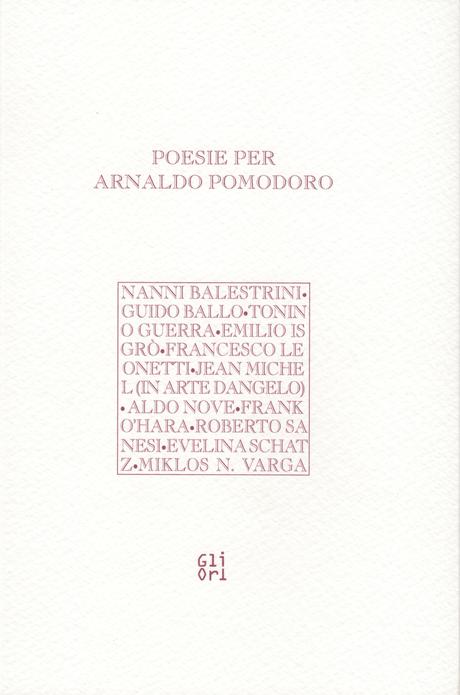 Collection of poems from 1964 to 2016, dedicated to Arnaldo Pomodoro by poet friends (Frank O’Hara, Guido Ballo, Francesco Leonetti, Aldo Nove, Nanni Balestrini, Roberto Sanesi among others). Introduction by Paolo Di Stefano.