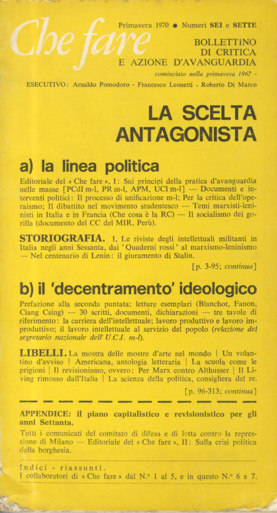 This text, published without indication of author in the avant-garde magazine «Che fare» (n. 6/7, spring 1970, pp. 269-272), is due to the collaboration between Francesco Leonetti and Arnaldo Pomodoro – founders and editors of «Che fare» – in dialogue with Kynaston McShine, the young art critic indicated as “K” in the text. The story was “rediscovered” and attributed to the two authors during the preparation of the exhibition La negazione della forma. Arnaldo Pomodoro tra minimalismo e controcultura.