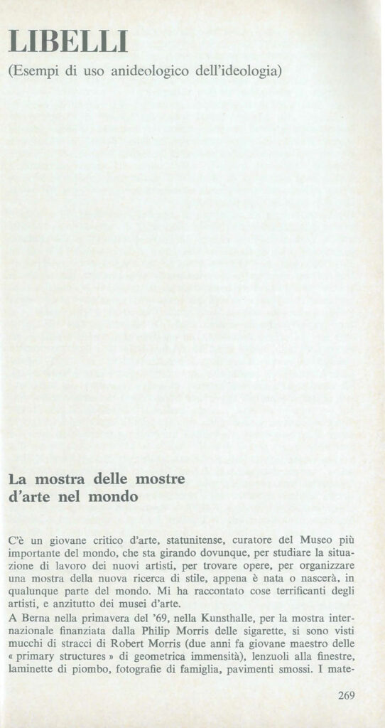 The inspiration for the story is the research actually conducted by McShine in order to draw up «a international report on recent activity of young artists», of whom would have given account, in a few months, with the exhibition Information (MoMA, New York, 2 July – 20 September 1970), one of the first and most important exhibition opportunities to bring the phenomenon into focus , then emerging, of conceptual art. Staging an account of travel ironic and playful, Leonetti and Pomodoro offer the reader their position, at times strongly critical, on the recent evolutions of the international artistic panorama. Lamenting the speed with which the "geometric immensity" of the minimalist phenomenon seemed to have been archived, the two authors contest the "productivist spiral" that increasingly afflicts the art world, linking it to the emptiness of experiences that reduce the art of avant-garde – once “language of opposition to society, with a subversive or utopian intent” – to a form of “advertising of the society that uses it”.