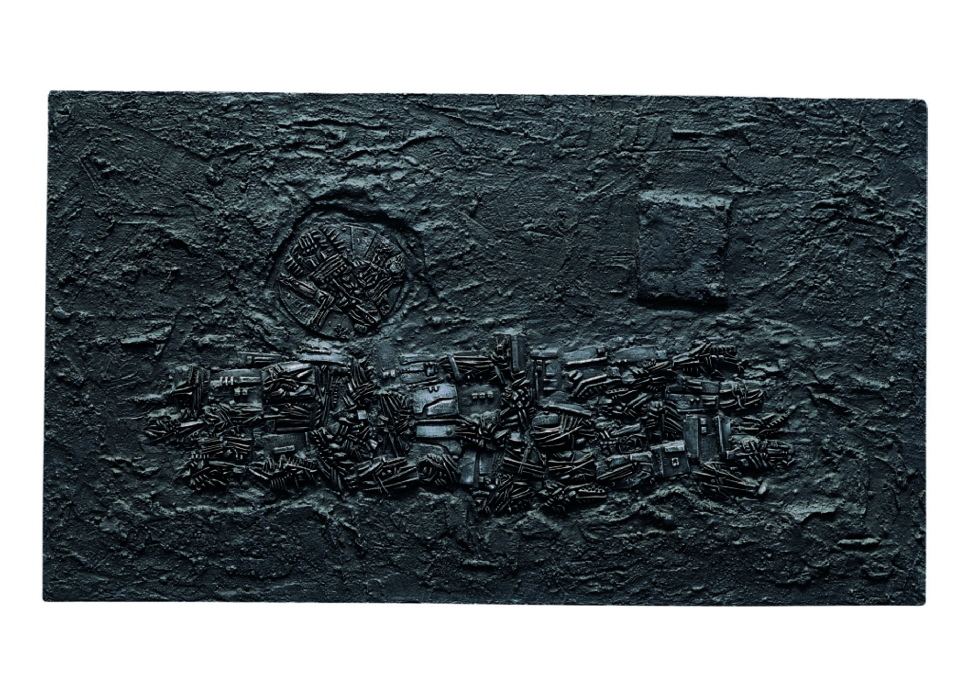 Inside this dark, moving, dug and marked wall, below, there are tangles of different imprints, dismantled mechanisms, fragments of machines with bladed combs, panels in relief, apparently disjointed elements, like a set of found objects... But within this complex system of signs you discover something else, the idea of ancient ideograms, archaic illegible writings, systems of signs which now appear confused, overlapping, which have thickened and which have therefore re-emerged, emerging as if from an archaeological excavation. Therefore the idea of time and that of the scriptures.