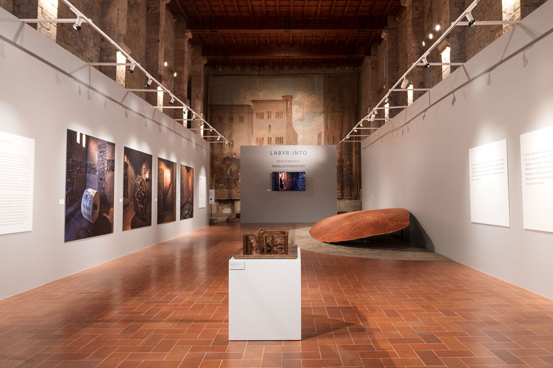 The multimedia exhibition, set up in the captivating setting of the Sala delle Pietre at Palazzo del Popolo, is a tribute and a narrative of Ingresso nel labirinto (1995-2011), one of the most fascinating and enigmatic works by Arnaldo Pomodoro. It is an environmental installation of approximately 170 square meters located in the basement of the former Riva Calzoni steelworks in Milan.