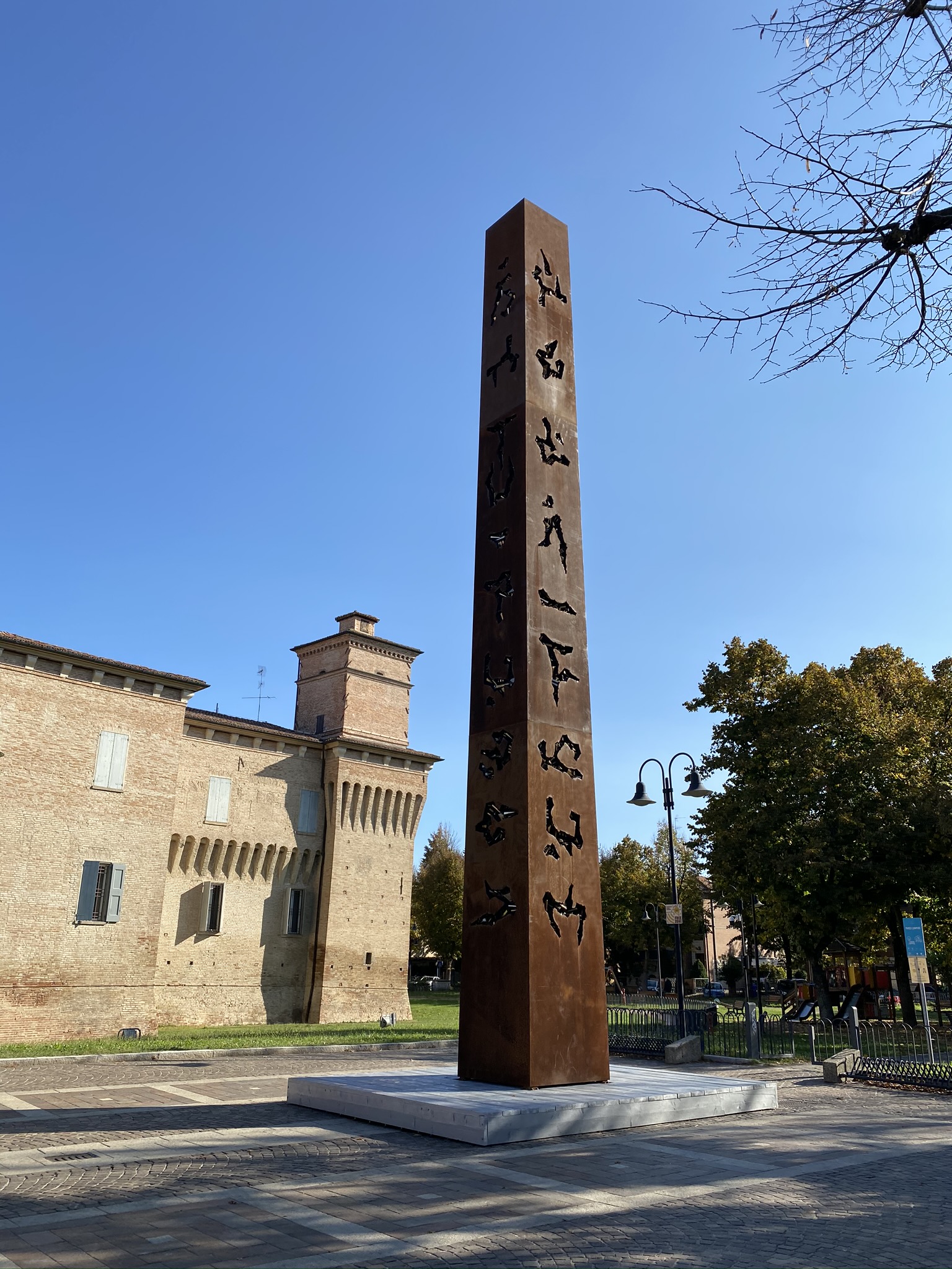 The Obelisco per Cleopatra is, therefore, the present sign of a timelapse journey into the interiority of Arnaldo Pomodoro to discover the passions that stimulated his creativity and oriented his critical gaze towards life and history, filtered through the medium of theater and then sculpture. The theatrical mask that the actor wears, giving the spotlight to his character, marks the boundary of a mental space within which Arnaldo Pomodoro struggles to delimit his yearning for infinity, a metaphor for the freedom and serenity that every human being should deserve. This is why the perfect geometry of the obelisk is corroded by a powerful informal sign, instinctive but always rational, capable of revealing the deception of the senses when life is lived only superficially. “The theater – says Arnaldo Pomodoro – was a new source of revelations in terms of ideology, myth and form, and especially in large sculptures it encouraged and even inspired me to experiment with new approaches and new ideas for sculptures designed for specific places in which relationships with the surrounding physical environment, cultural paradigms and utilitarian functions can play an important role”.