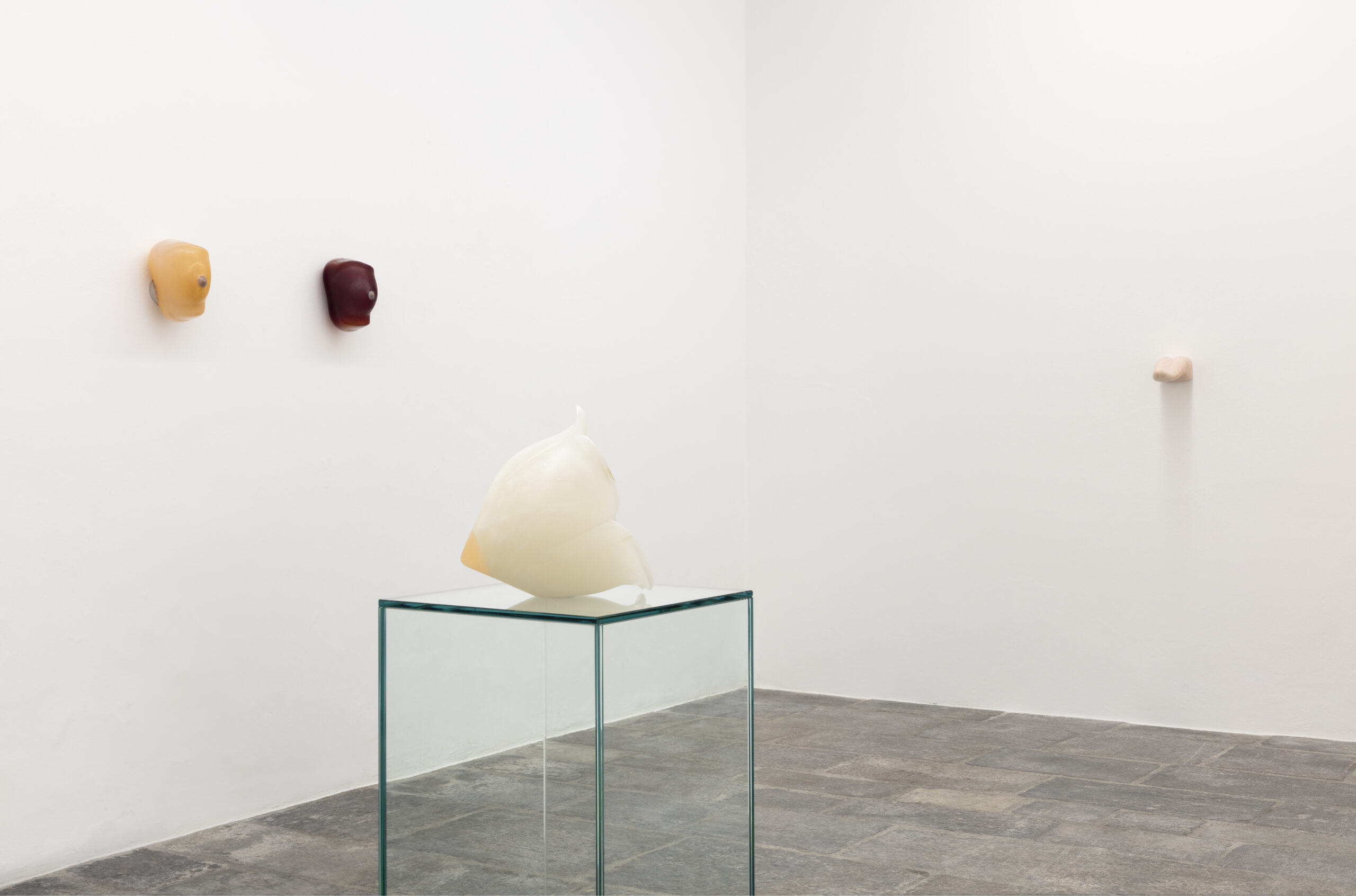 Nevine Mahmoud (London, 1988 – lives and works in Los Angeles) and Margherita Raso (Lecco, 1991 – lives and works between Basel and Milan) both ground their practices in a hands-on approach with materials and techniques: sculpted or blown works for the former, mechanical or manual loom works for the latter. The result for Mahmoud is standalone objects, distinctly sensual representations of body parts or natural elements that present themselves as closed forms, self-referential sculptural worlds. Raso’s fabrics, on the other hand, present works without a fixed or stable form: surfaces of great tactile and visual quality that occupy space by hanging from the ceiling, clinging to the walls, or resting on found surfaces. The dialogue between the two artists expands through the intervention of Derek MF Di Fabio (Milan, 1987 – lives and works between Perdaxius and Berlin). Di Fabio’s work often consists of workshops, with the final result being of relatively little object-based importance. Their poetic focus shifts towards the situations, on how they can be heard and interpreted.
