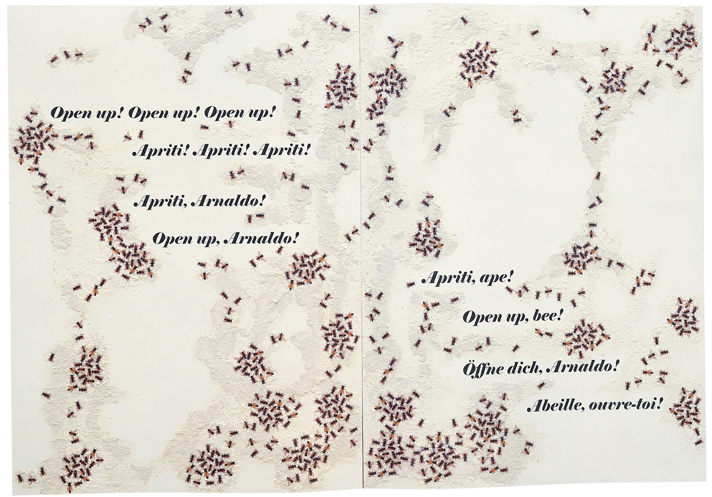 La stesura monocroma su tavola in Isgrò serve a dar vita ad un paradosso, in linea con la critica che l’artista muove al linguaggio e alla sua capacità di comunicazione. Dopo i testi cancellati, dove solo alcune parole lasciate leggibili fornivano la chiave interpretativa dell’atto, e altre ricerche avvicinabili alla Poesia Visiva (se ne trovano esemplari nelle opere donate a Pomodoro dall’artista, come Arnaldus e Open Up Arnaldo, segno del loro lungo e stretto legame d’amicizia), Isgrò negli anni Settanta si avvicina alle ricerche concettuali saggiando il potenziale comunicativo del rapporto fra parola e immagine, che l’opera s’ingegna di decostruire ironicamente.